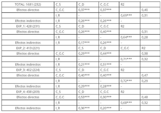 Respecto al papel moderador de la variable experiencia -Hipótesis 3-, como en el caso general, también se detectaron leves diferencias aunque significativas en términos de las medidas de posición de las variables de interés. Al analizar los resultados de los modelos de ecuaciones simultáneas en las cuatro submuestras definidas por la variable experiencia del estudiante, en primer lugar se observa que los estadísticos de bondad de ajuste del modelo nos permiten no rechazarlos. Dichos estadísticos e índices evidencian un ajuste razonable para cada una de las submuestras (EXP_1: (2(2) = 7.42, RMSEA= .08, SRMR= .03, CFI= .97; EXP_2: (2(2) = 24.18, RMSEA= .08, SRMR= .05, CFI= .94; EXP_3: (2(2) = 11.42, RMSEA= .08, SRMR= .03, CFI= .97; EXP_4: (2(2) = 1.87, RMSEA= .00, SRMR= .02, CFI= .99).