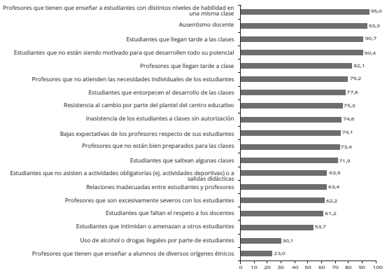 En el otro extremo, los problemas menos declarados, con proximidad a nunca, refieren a la necesidad de enseñar a estudiantes con diferentes orígenes étnicos (1,31), al uso de alcohol o drogas (1,38) y al tener docentes excesivamente severos con los estudiantes (1,75).