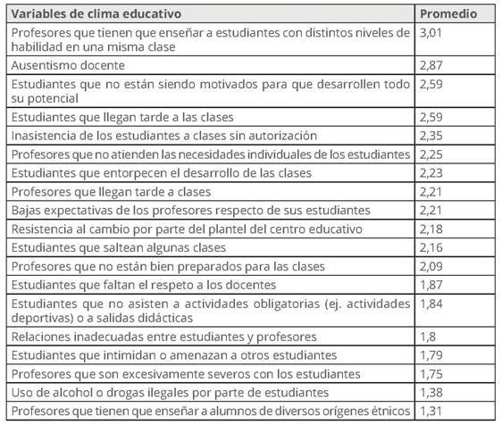 Como vemos en el Tabla 1, según los directores de los centros educativos los problemas que más deben enfrentar en términos de clima escolar refieren, en primer lugar, a tener que enseñar a estudiantes con diferentes niveles de habilidades (3,01), al ausentismo docente (2,87), a los estudiantes que no están siendo motivados como podrían y a los estudiantes que llegan tarde (2,59). Tomando las referencias de respuesta, los directores de centros educativos declararían que estos problemas acontecen en cierta medida.