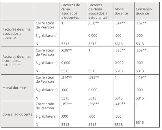 Para estudiar que las variables efectivamente den cuenta de un gran constructo sobre clima educativo, fueron correlacionados los cuatro índices (Tabla 2).