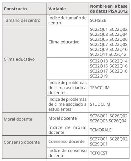 Para estudiar el clima educativo a partir de sus factores se tomarán los índices de constructo generados por PISA. Los mismos tienen la ventaja de estandarizarse según las mismas pautas en todos los países. El índice tiene la desventaja de desanclarse de los ítems concretos que forman la variable latente pero gana en la robustez de su comparabilidad (OECD, 2014).