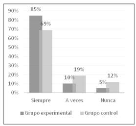 • En el ítem 1 el 85% de los alumnos del grupo experimental y el 69% del grupo control siempre han entendido el concepto de patrimonio cultural como una construcción socio-cultural, mientras que el 5% y 12% de los estudiantes del primer y segundo grupo respectivamente nunca entendieron este concepto (Gráfico 1).