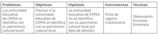 Luego de haber contrastado su ficha de registro con la literatura sobre los elementos patrimoniales de Pueblo Libre los educandos, a través de las interrogantes de la semana 5, seleccionan y proponen el problema de investigación para establecer los objetivos y las hipótesis en una matriz facilitada por el docente (semana 8). De igual modo, se optó por utilizar dos técnicas (encuesta y entrevista) dirigidas a la comunidad educativa (educadores, compañeros de otros ciclos, padres de familia, personal administrativo, etc.) para lo cual se elaboró un cuestionario de preguntas abiertas y cerradas (semana 9). Durante el taller N.° 2 todos los educandos del grupo experimental aplicaron el instrumento (semana 10). Sin embargo se seleccionaron al azar los equipos para encuestar y entrevistar a determinados segmentos de la comunidad educativa citada. Luego los alumnos procesaron la información a partir de la descripción e interpretación de resultados con gráficos estadísticos para analizarlos y establecer sus conclusiones (semana 11).