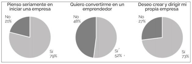 Los hallazgos del escrutinio de la intención de emprender de los estudiantes mostraron que la mayoría han pensado en iniciar una empresa (79%) y que están dispuestos a esforzarse por crear y dirigir su propio negocio (73%). Asimismo, más de la mitad del alumnado reconoció tener como objetivo profesional convertirse en un emprendedor (52%). Ver la Figura 1.