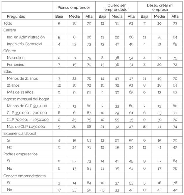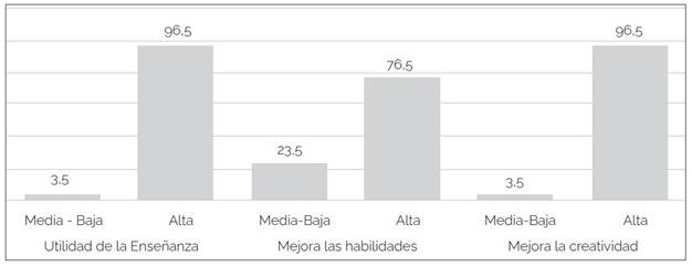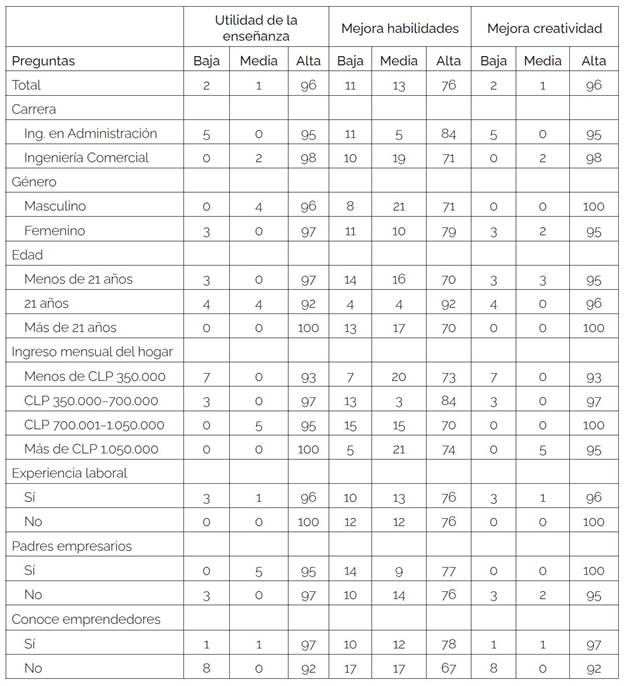 La valoración de la enseñanza del emprendimiento se evaluó mediante tres preguntas que analizaron la utilidad percibida de estudiar emprendimiento (“creo que aprender sobre emprendimiento es útil para mi vida futura”), el aporte de esta enseñanza al desarrollo de habilidades emprendedoras (“creo que las habilidades emprendedoras se adquieren a través de la formación”) y su contribución para mejorar la creatividad y aversión al riesgo (“creo que los cursos de emprendimiento mejoran la capacidad para generar ideas creativas y enfrentar el riesgo”).