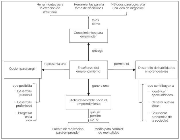 No obstante cabe señalar que la enseñanza del emprendimiento no se limita a la impartición de técnicas y procedimientos para la creación de empresas y su gestión (enfoque utilitarista), sino que persigue la formación integral de sujetos sociales capaces de emprender en todos los ámbitos de la actividad sociocultural y profesional. Así, la docencia universitaria tiene el desafío de garantizar el desarrollo cognitivo, actitudinal y valórico del alumnado, con base en el establecimiento de enfoques, estrategias pedagógicas y estilos de enseñanza que estimulen la participación activa del estudiante en la construcción de su propio aprendizaje (Aldana-Rivera et al., 2019).