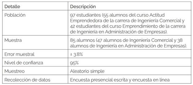 La población estuvo conformada por el estudiantado de dos carreras del área de las ciencias administrativas (Ingeniería Comercial e Ingeniería en Administración de Empresas) que cursaban dos asignaturas semestrales obligatorias de emprendimiento (Actitud Emprendedora y Emprendimiento), con cupos promedio de 50 alumnos.