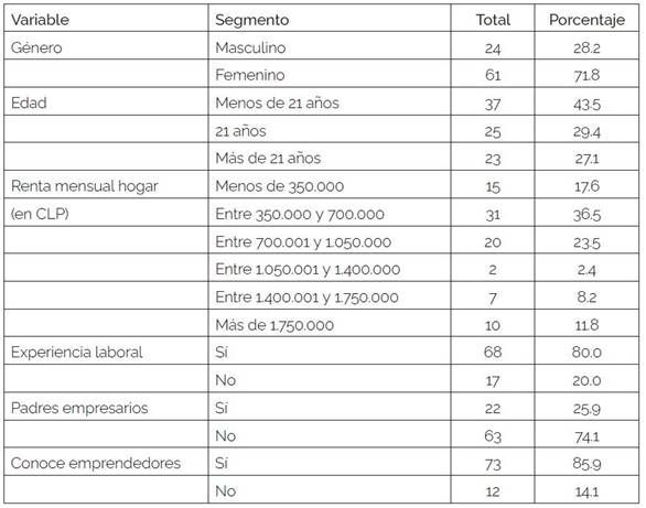 Los participantes del estudio fueron 85 alumnos de las carreras de Ingeniería Comercial (55%) e Ingeniería en Administración de Empresas (45%) que estudiaban en una universidad pública chilena. La caracterización de la muestra se presenta en la Tabla 2, en la que se aprecia que el alumnado se vincula con el emprendimiento principalmente a través de las experiencias de personas que han emprendido fuera de sus padres o tutores (solo el 26% tiene padres empresarios).