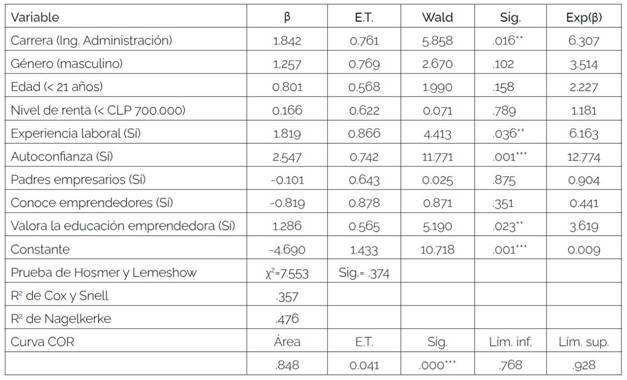 Para el modelo, la variable dependiente es la IE (sí = 1, no = 0) y las variables independientes se agruparon en categorías dicotómicas donde se consideraron los siguientes ítems: autoconfianza (sí = 1; no = 0), conocimiento de emprendedores (sí = 1, no = 0), padres empresarios (sí = 1, no = 0) e importancia percibida sobre la educación emprendedora (sí = 1, no = 0). Se agregaron variables sociodemográficas como el sexo (hombre = 1, mujer = 0), la edad (menor a 20 = 1, 20, o más = 0), la situación laboral (sí trabaja = 1, no trabaja = 0) y el nivel de ingresos (hasta CLP 1.500.000 = 1, más de CLP 1.500.000 = 0).
