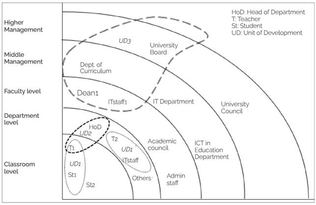 Briefly explained, the unit of development 1 is formed by the professor and the students as the participants, at the same level; the classroom. That can be called a collective in-level unit of development. The unit of development 2 is between professors and the Head of Department as a cross-level unit of development. Finally, the unit of development 3 is formed by a Dean and IT staff at the Faculty level, together with the institutional department of curriculum and the University Board. UD3 can be called an expanded unit of development.