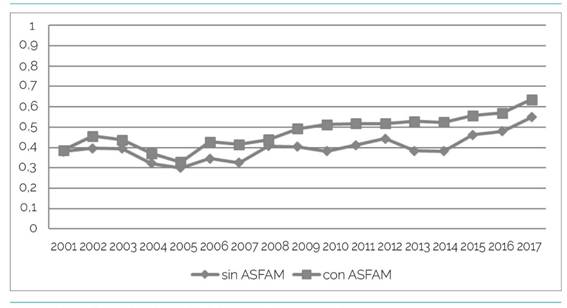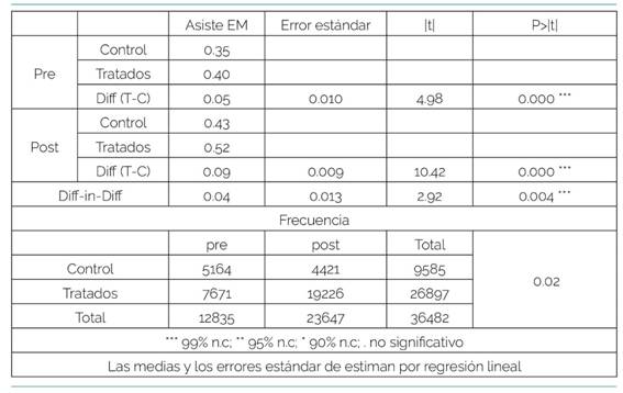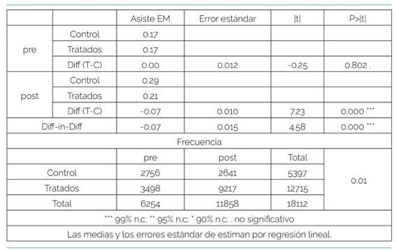 Con respecto al problema de investigación planteado se observa la diferencia en la asistencia a Educación Media Básica y Media Superior, desde el 2001 y hasta el 2017, considerando como punto de corte pre-post la nueva modalidad de Asignación Familiar del Plan de Equidad introducida a partir del año 2008. Evidentemente, diff in diff es una técnica cuya eficiencia depende de una importante cantidad de decisiones, ancladas en elementos tanto empíricos como teóricos. Una primera consideración corresponde al indicador escogido para la evaluación del efecto, el que en este caso corresponde a la asistencia a la educación formal obligatoria, en primera instancia en Educación Media Básica y Educación Media Superior. La razón de escoger el indicador de asistencia se corresponde con el diseño de la política, en el cual no existe un estímulo por la acreditación de grado o nivel, sino que se renueva o cancela, condicionada a la asistencia a la educación formal. Un segundo elemento del constructo corresponde al momento en el que aplicar el estímulo. Para este ejercicio se utiliza el 2008, año en el cual entra en vigencia la reforma del sistema de Asignaciones Familiares, cuando se implementa una serie significativa de cambios, incrementándose el monto, la cobertura, a la vez que se cambia el criterio y el método de focalización.