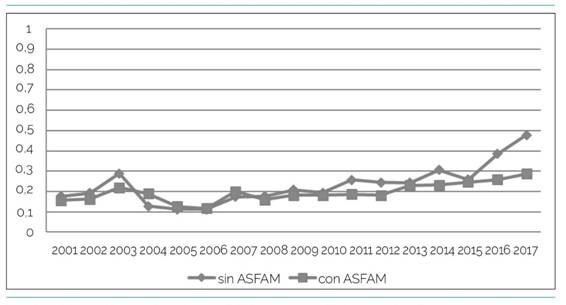 El Gráfico 1 representa la evolución de la asistencia a la Educación Media Básica para los jóvenes de entre 12 y 17 años que, perteneciendo a los quintiles 1, 2 y 3, pareados de acuerdo al criterio de asignación de la transferencia, que han sido y no han sido beneficiarios de Asignaciones Familiares en Uruguay. Lo que se observa es que las series evolucionan de manera paralela, principalmente en el recorrido pre tratamiento del 2001 al 2007, para luego ampliar su diferencia en el periodo post-tratamiento. En este caso, observando cada una de las series, se podría esperar algún efecto significativo en el cambio y la ampliación del régimen de Asignaciones Familiares. Más allá de las diferencias en los periodos pre-post, nuevamente se ve una tendencia general de crecimiento de la matrícula durante el periodo. Nuevamente, el supuesto de las tendencias paralelas parece ser modesto.