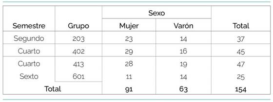 En la Tabla 1 aparece la distribución detallada de la muestra en función del semestre, nivel escolar o curso, el grupo y el sexo de los participantes.