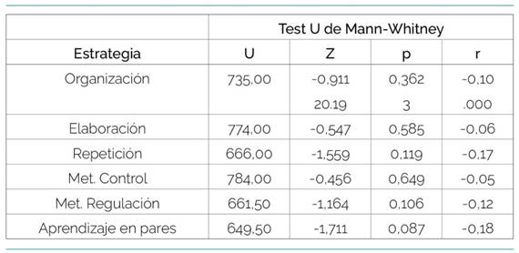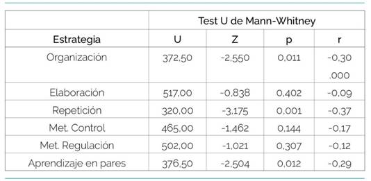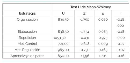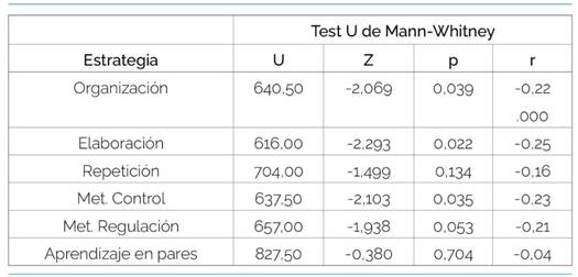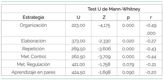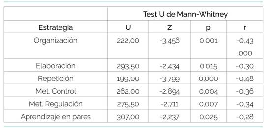 Se encontró que las diferencias son estadísticamente significativas en las estrategias de organización, elaboración, repetición, metacognitiva de control, metacognitiva de regulación y aprendizaje en pares.