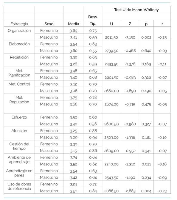 De las 12 estrategias evaluadas únicamente se encontraron diferencias estadísticamente significativas en las estrategias de organización, ambiente de aprendizaje y uso de obras de referencia, destacando que el uso es predominante en las alumnas. En lo que respecta a la ausencia de diferencias en las otras estrategias se puede plantear que los resultados sugieren un empleo similar en las demás estrategias en ambos sexos.