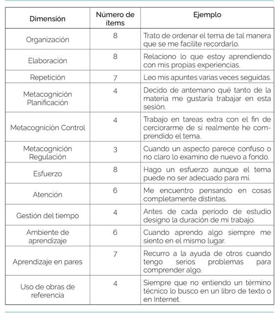 Wild y Schiefele (1994) y Griese et al. (2015) modificaron el cuestionario original LIST a 69 ítems y eliminaron la subescala denominada Chequeos Críticos (Critical Checks) porque no parecía apropiada para las matemáticas al comienzo de la universidad. Así, en esta investigación se utilizó el LIST de 12 dimensiones con 69 ítems dado que se ajustaba mejor a las características de la muestra de participantes del estudio (Tabla 2).
