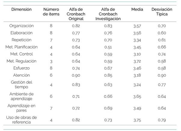 En primer lugar se volvió a evaluar la consistencia interna de las dimensiones mediante el alfa de Cronbach. Asimismo se analizaron los datos para detectar posibles diferencias en el empleo de estrategias de aprendizaje en matemáticas en función del semestre académico y del sexo.