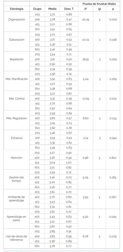 La evidencia de que existe un mayor uso de estrategias de aprendizaje a medida que el curso escolar aumenta (Gasco-Txabarri, 2016) se observa en este estudio principalmente al analizar los datos de los grupos de cuarto y sexto semestre, es decir, los grupos 413 y 601, respectivamente.