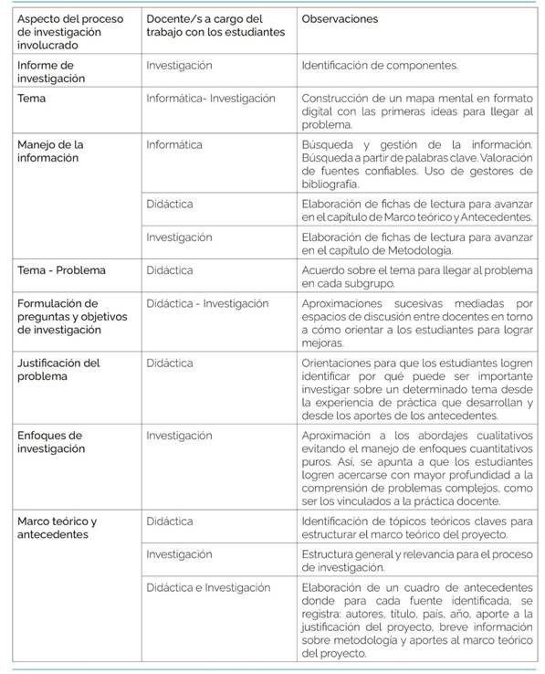 Al inicio del proceso, se planteó la necesidad de contar con la presencia de la docente de Investigación Educativa en todos los espacios de intercambio y de coordinación entre los docentes del nivel de tercer año. Este aspecto es clave para generar acuerdos y evitar contradicciones entre las orientaciones que llegan a los estudiantes desde Investigación educativa y desde las Didácticas. Los docentes de didáctica enfatizaron la importancia y necesidad de una efectiva coordinación mediada por una fluida comunicación, tanto entre los docentes como entre los docentes y los estudiantes. Esta “tensión” inicial logró superarse cuando la profesora de Investigación se integró a todos los espacios de encuentro sincrónico. Allí se plantearon las inquietudes en un ámbito dialógico y profesional. Se alcanzaron acuerdos consensuados que permitieron que el equipo saliera fortalecido profesional y humanamente. Otro hito que facilitó la comunicación fue la realización de encuentros de orientación conjunta con cada equipo de trabajo durante el segundo semestre.