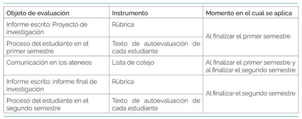 En la Tabla 2 se detallan los diferentes instrumentos diseñados colaborativamente en el nivel de tercer año. En algunos casos, los acuerdos también involucraron a los demás niveles comprendidos en la comunidad. Por ejemplo, en la evaluación de los ateneos emerge del acuerdo de toda la comunidad.