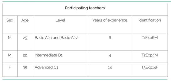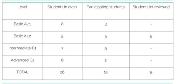 The groups were chosen by the institute, consisting of an intentional sample, not a random one. In addition, the institute avoided choosing groups that were already assigned for observation by teachers in training; the reason was to prevent those groups from having yet another interference. The institute was asked to select groups that were taught by the same teacher; for example, a teacher could have a basic and an intermediate group. It was intended to investigate a minimum of four teachers and their groups. From the selected groups, the one that was presented as the most heterogeneous (in terms of students’ age) was chosen for a semi-structured interview.