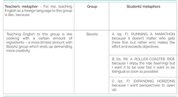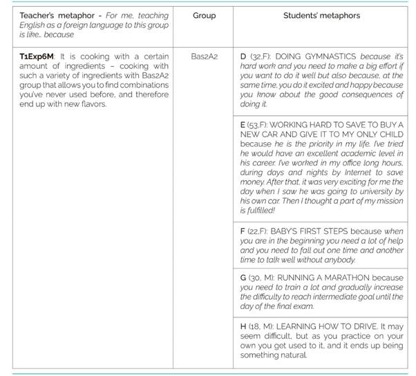 This is the group that allows the teacher to ‘cook with more ingredients’, and therefore, he is able to take better care of his students, offering them a variety of options in the classroom. The students’ metaphorical sentences reflect effort; even though their metaphors refer to individual effort, their letters demonstrate that they need one another throughout the learning process. Doing gymnastics, running a marathon, learning to drive, and, above all, the baby's first steps are individual efforts, but having somebody else’s help, support, and motivation is crucial.