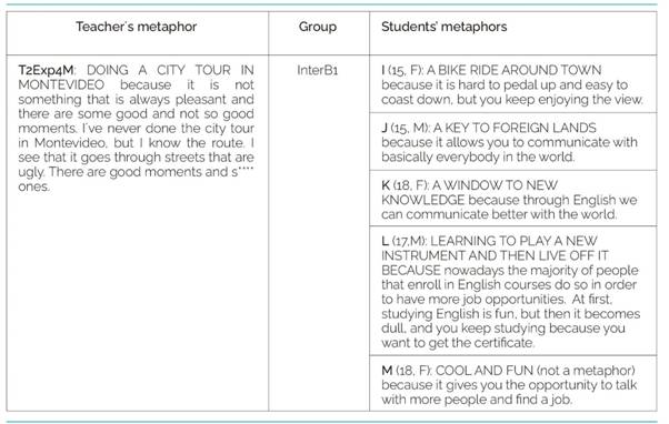 Most of the students’ metaphorical sentences are focused on making discoveries. Student I mentions a bike ride in the city, which implies some labor when pedalling up a hill, but is also connected to the idea of discovering places when visiting a new city; however, when going on a bike ride to visit new places, the tendency is to avoid hills. Other metaphors (students J and K) are related to exploring new places with unique opportunities. Student L’s metaphor, on the one hand, may be related to learning something new (such as a musical instrument). However, on the other hand, it is more connected with the idea of making an effort to master a certain skill; this is confirmed in his letter in which he mentions that it is necessary to be in constant contact with the language, make vocabulary lists, and use monolingual dictionaries.