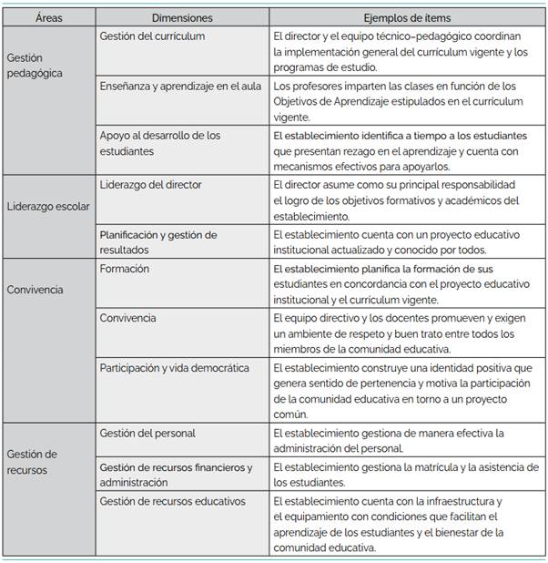 La encuesta cuenta con 42 ítems que examina distintas variables que permiten determinar el nivel de calidad de cada una de las prácticas institucionales y pedagógicas. La estructura corresponde a cuatro áreas de los procesos de gestión institucional. La primera, denominada Gestión pedagógica, cuenta con tres subdimensiones (gestión del currículum-enseñanza, aprendizaje en el aula-apoyo al desarrollo de los estudiantes) con 11 ítems, del tipo, El director y equipo técnico-pedagógico coordina la implementación general del currículum vigente y los programas de estudio.