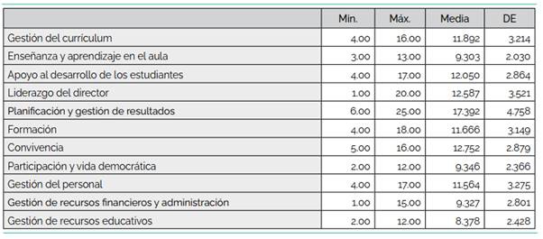 La segunda, denominada Liderazgo escolar, considera dos subdimensiones (liderazgo del director-planificación y gestión de resultados) con 10 ítems, del tipo, El director asume como su principal responsabilidad el logro de los objetivos formativos y académicos del establecimiento.