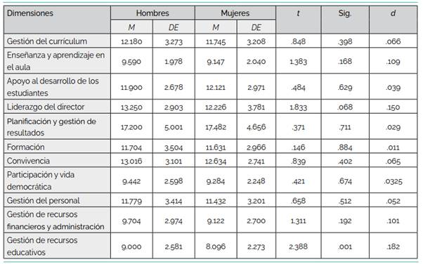Al examinar las posibles diferencias entre hombres y mujeres respecto a las variables examinadas solo se evidenciaron diferencias estadísticamente significativas en la dimensión Gestión de recursos educativos a favor del grupo de hombres (Ver Tabla 3).