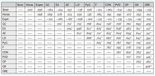Para revisar posibles relaciones entre las variables del instrumento y las variables sociodemográficas, se utilizó el coeficiente de correlación de Pearson (Véase en la Tabla 4). Los resultados dan cuenta de la existencia de una correlación significativa pero inversa entre el sexo de los profesores y la Gestión de recursos administrativos (r = -,179, p < .005), entre los años de experiencia y el Apoyo al desarrollo de los estudiantes (r = -,162, p < .005) y entre los años de experiencia y Gestión de recursos financieros y administración (r = -,151, p < .005).