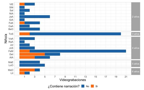Para responder (a), en §1.4, se identificaron las videograbaciones que contenían secuencias narrativas (Labov, 1972) producidas por los niños. Para caracterizar estas secuencias, la tercera autora determinó si se empleaban con el propósito de compartir experiencias pasadas -narrativas personales- (Fernández & Melzi, 2008; Nelson, 1996), planificar eventos futuros -narrativas futuras- (Hudson, 2006) o compartir eventos ficcionales -narrativas de ficción- (Nelson, 1996). Por otra parte, las narrativas fueron categorizadas como heterorreguladas, de regulación compartida y autorreguladas por la cuarta autora, según el grado de participación del adulto en la construcción del relato infantil. Adicionalmente, la quinta autora especificó si involucraban interacciones sincrónicas -en las que los interlocutores participaban al mismo tiempo- o asincrónicas -los interlocutores participan en distintos momentos, por ejemplo, cuando el niño grababa un mensaje para que otro lo escuche posteriormente-. Por último, la sexta autora indicó si la tecnología mediaba la comunicación con otras personas, o bien era empleada por el niño con otros fines, por ejemplo, jugar solo.