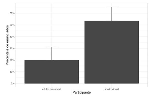 En las narrativas analizadas, la mayoría de las intervenciones provienen del adulto que participa virtualmente. Este constituye el interlocutor principal del niño: en promedio, más del 50 % (DE = 12.00 %) de los enunciados provienen de este participante. El adulto que se encuentra presente participa en menor medida: en promedio, entre las situaciones en las que intervienen adultos presenciales (n = 9), solo alrededor del 20 % (DE =11.16 %) de las emisiones fueron proferidas por ellos. Véase la Figura 2.