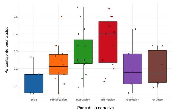 Por otra parte, el análisis mostró una mayor presencia de emisiones producidas por adultos virtuales en la orientación de las narrativas. Muchas de ellas contribuyen con la construcción del marco de la narración al solicitar mayor contextualización por parte de los niños para asegurar la comprensión del relato. Asimismo, se observó que otras intervenciones del adulto virtual que buscan reparar fallas técnicas de la comunicación también se concentran en la orientación, así como en la complicación, lo que sugiere la relevancia de estas partes del relato para construir el sentido global de la narrativa.