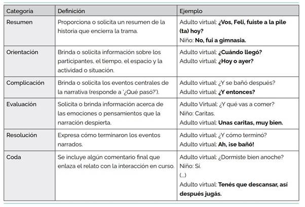 En estos 7 videos, se identificaron 21 narrativas, cuyos límites fueron establecidos en función de la continuidad de un mismo tópico (Beals & Snow, 1994). Las narrativas fueron procesadas con ELAN (2022) para transcribir y segmentar el habla de todos los participantes con base en la noción de unidad terminal, compuesta por una cláusula principal y las cláusulas subordinadas a ella (Hunt, 1970). La segunda autora identificó los participantes como “adultos” o “niños,” y como “presenciales” o “virtuales” -según se encontraran en el hogar con el niño o se comunicaran con él mediante un dispositivo tecnológico-. También en ELAN, la primera autora identificó a qué parte de la narrativa contribuían las distintas intervenciones adultas e infantiles -véase (b), en §1.4-. Para ello, se adaptó la propuesta de Labov (1972, 2010). La Tabla 1 ilustra el sistema de categorías empleado. Los casos que generaron dudas, fueron discutidos grupalmente hasta llegar a un acuerdo.