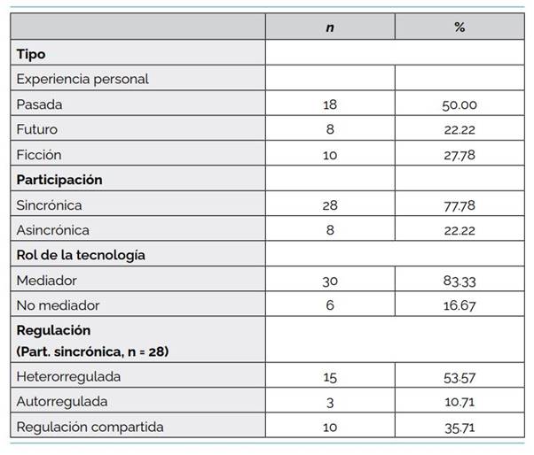 En las 18 videograbaciones que contienen relatos infantiles se identificaron 36 secuencias narrativas. La mayoría era de experiencias personales ocurridas en el pasado (50 %), aunque también se encontraron relatos de eventos futuros (22 %) y de ficción (28 %). La mayor parte de estas narraciones se desplegó durante situaciones de interacción sincrónica (77 %) en las cuales el dispositivo tecnológico mediaba la comunicación (83 %). Entre las narraciones producidas durante interacciones sincrónicas, un 53 % fueron heterorreguladas, mientras que casi un 36 % fueron reguladas de manera compartida, y alrededor de un 11 % fueron reguladas exclusivamente por el niño (autorreguladas). Esta información se presenta en la Tabla 2.