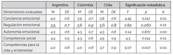 De acuerdo al test F, se reportan diferencias estadísticamente significativas en conciencia emocional (F = 4.45, p = 0.012) con un tamaño del efecto pequeño (η² = 0.01). En esta dimensión, los estudiantes argentinos reportan mayores puntuaciones. Del mismo modo, en competencia social se reportan diferencias estadísticamente significativas (F = 4.3, p = 0.014 con un tamaño del efecto pequeño (η² = 0.01). Cabe destacar que, en esta dimensión, las diferencias se dan entre los tres grupos, siendo el grupo de estudiantes chilenos el que obtiene la puntuación media mayor y el del grupo de colombianos, la menor puntuación. Finalmente, también se encuentran diferencias estadísticamente significativas en la dimensión competencias para la vida y el bienestar (F = 5.1, p = 0.007) con un tamaño del efecto pequeño (η² = 0.02). En este caso son los estudiantes chilenos quienes obtienen una puntuación media, significativamente menor.