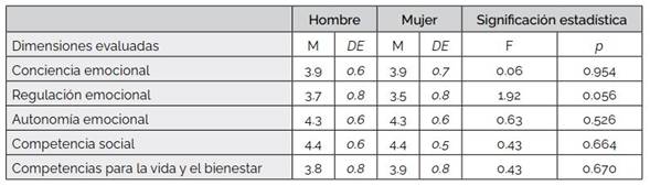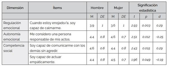 Los indicadores que diferencian las autopercepciones de hombres y mujeres participantes de este estudio son: el 6, perteneciente a la dimensión de regulación emocional, ítem en el que los hombres, en promedio, puntúan más alto que las mujeres; el ítem 11 de autonomía emocional, en el que las mujeres puntúan más alto; y los ítems 15 y 16, pertenecientes a la dimensión de competencia social, en caso del ítem 15 son los hombres quienes obtienen puntuaciones más altas y en el 16, las mujeres (véase Tabla 3).