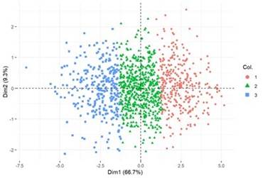 A partir de estas apreciaciones, interesa conocer cuáles son las características de los grupos de docentes que integran cada clúster. En la Figura 10, se observan individuos representados por sus dos primeras componentes principales. Los colores y el formato de los puntos indican el clúster de pertenencia.