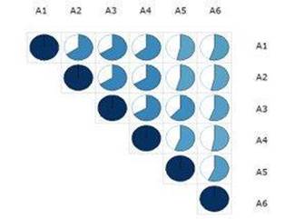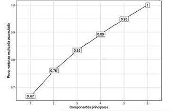 La superficie del sector circular correspondiente a cada uno de los cruces entre dos áreas competenciales evidencia la fuerza de esta asociación. Una vez establecida la existencia de asociación entre estas variables, se desea explorar la presencia de variables latentes en el conjunto de características competenciales evaluadas. Con este objetivo, se conduce un análisis de componentes principales. Luego se seleccionaron las dos primeras componentes ya que entre ambas logran explicar el 76 % de la variabilidad total de los datos, destacando que la primera componente principal explica un 66.7 % de la variabilidad total (ver Figura 5).
