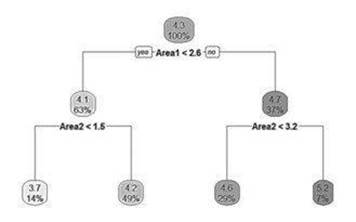 Las variables consideradas para este árbol son las puntuaciones en las áreas competenciales y la variable respuesta a explicar es la puntuación en la ACDD. Para evitar el sobreajuste y favorecer la generalización se utilizó el criterio de tamaño mínimo de cada hoja.