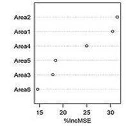 Con el criterio del árbol antes descrito, posteriormente se aplicó la técnica de random forest considerando la construcción de 500 árboles aleatorios basados en la misma muestra de respuestas docentes. Se advierte en la Figura 8 que las CD de las áreas 1 y 2 son las que mayor impacto tendrían en la regresión en caso de ser excluidas del análisis, con una influencia notablemente superior a las de las restantes áreas. Esto confirma lo observado en el árbol y también en el contraste definido por la segunda componente principal.