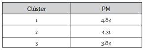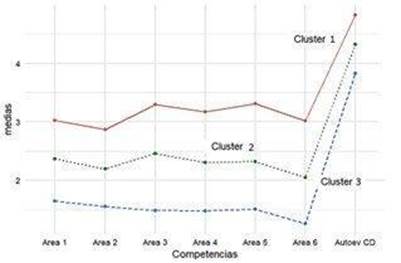 En la Tabla 5 se aprecian niveles bien diferenciados respecto de ACDD. La Figura 9 muestra las puntuaciones medias de cada área competencial y el puntaje promedio de la ACDD de cada clúster. Se observa un paralelismo en las poligonales que indicaría que la ACDD sigue la misma tendencia que los puntajes medios de las áreas competenciales. Se destaca además que el clúster 1 es el que ostenta los puntajes medios más altos, mientras que el clúster 3, es el de los más bajos. Asimismo, en los clústeres 1 y 2 el área 3 recibe el mayor puntaje mientras que, en el clúster 3, la mayor valoración se da en el área 1. Para los tres grupos, el área 6 presenta las puntuaciones más bajas.