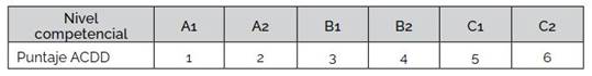 Para el caso de la variable ACDD se decidió asignar una escala del 1 al 6, siendo 1 la menor valoración y 6, la máxima. Considerando los niveles competenciales propuestos en DigCompEdu (Redecker, 2020) en el presente estudio se decidió relacionar cada valor del puntaje de ACDD con un nivel competencial (ver Tabla 1).
