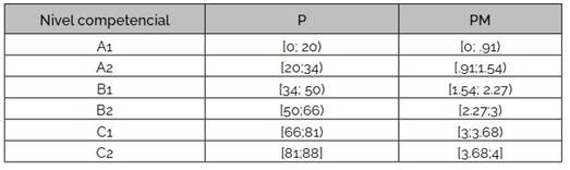 Esta situación se corresponde con la distribución de las frecuencias porcentuales por niveles: A1 con el 1 %, A2 con el 10 %, B1 y B2 con el 36 % respectivamente, C1 con el 14 % y C2 con el 2 %.