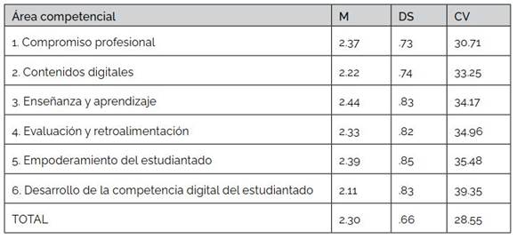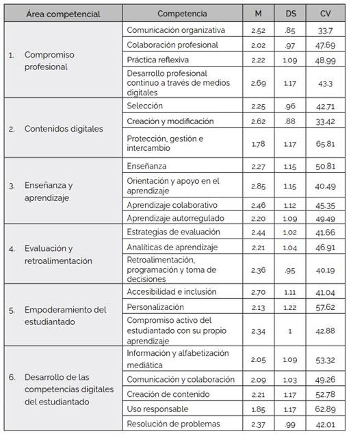 En la Tabla 3 se pueden apreciar los puntajes medios, desvíos y CV de las CDD obtenidos en la muestra, tanto para cada uno de los ítems de las seis áreas competenciales de DigCompEdu (Redecker, 2020) como para el puntaje promedio total.