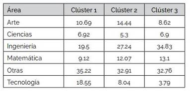 En cuanto a las áreas de desempeño del profesorado estudiado, la Tabla 6 describe los porcentajes por clúster.