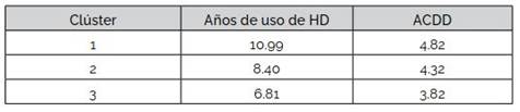 La Tabla 7 compara, por clúster, la antigüedad promedio en el uso de HD con el puntaje promedio de la ACDD.