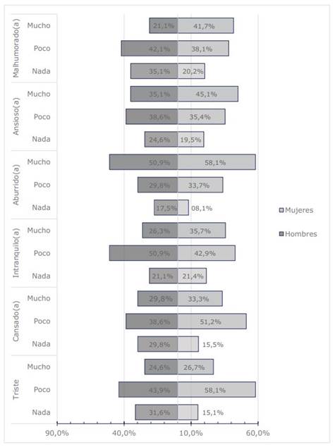 En la figura 1, se muestran las diferencias socioemocionales distribuida por sexo, donde el 26.7 % de las mujeres y el 24.6 % de los hombres señalaron haberse sentido muy triste durante el confinamiento por la pandemia; el 33.3 % de las mujeres y el 29.8 % de los hombres manifestaron haberse sentido muy cansados(as); el 35.7 % de las mujeres y el 26.3 % de los hombres indicaron haberse sentido muy intranquilos(as); el 58.1 % de las mujeres y el 50.9 % de los hombres refirieron haber estado muy aburridos(as), el 45.1 % de las mujeres y el 35.1 % de los hombres manifestaron haber estado muy ansiosos(as) y, finalmente el 47.1 % de las mujeres y el 21.1 % de los hombres señalaron haber estado muy malhumorados(as).