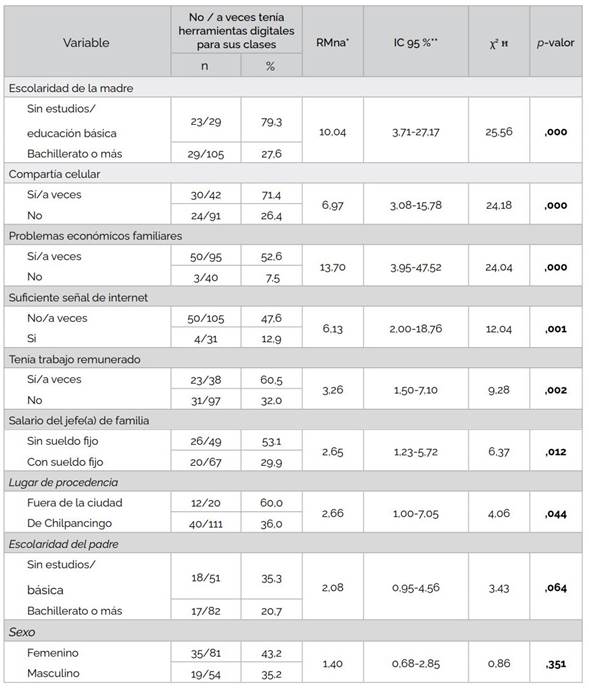 En primer lugar, la estadística descriptiva y para medir la potencial asociación entre los distintos factores incluidos en el estudio, se utilizó Microsoft Excel y el paquete estadístico SPSS, versión 25 (IBM Corp, 2017) para el análisis descriptivo e inferencial. La asociación entre las variables incluidas en el estudio y la falta de herramientas digitales para sus clases virtuales, así como su potencia estadística, se realizó mediante el análisis de los ítems dicotómicos o bivariado a través del proceso de Mantel-Haenszel mediante el odds ratio (OR), con un intervalo de confianza de 95 % (IC 95 %) y la tasa de error (Mantel & Haenszel, 1959), así como el ANOVA. La aplicación informada de la encuesta se realizó de forma anónima y voluntaria a estudiantes de los tres grados académicos de la preparatoria número 9 de la UAGro, previa autorización de la dirección escolar.